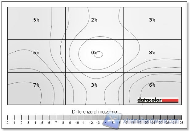 Suddividendo lo schermo in nove rettangoli, abbiamo misurato con il colorimetro l’uniformità della luminosità e dei colori. La differenza massima registrata è risultata pari al 7%, con una media del 3,8%, per quanto riguarda la luminosità, mentre per il colore, il Delta-E maggiore è stato di 2,1, con una media dell’1,2. La media scende rispettivamente al 2,6% e a 0,8 attivando la modalità SmartUniformity.