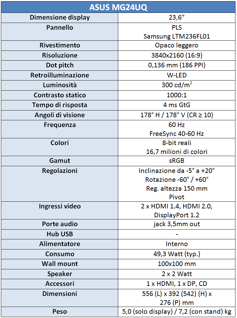 Per quanto riguarda il pannello adottato, sul sito ASUS e nei comunicati ufficiali, viene indicato solo che si tratta di un IPS, senza entrare nel dettaglio. Trattandosi però di un LCD da 23,6”, potrebbe trattarsi del modello PLS LTM236FL01 di produzione Samsung.