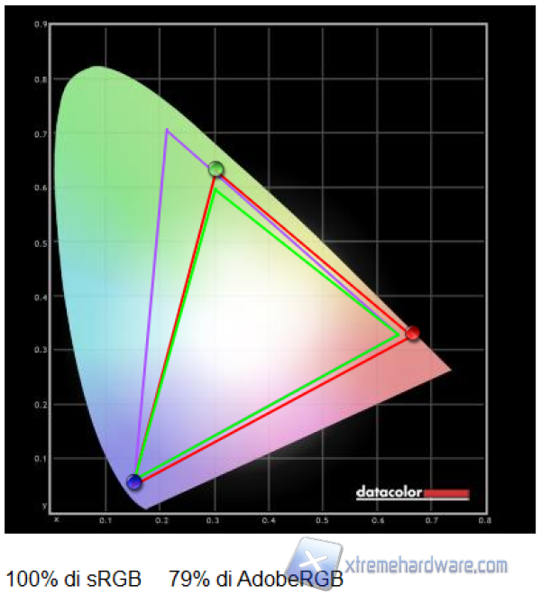 Soddisfacente è il range di luminosità che va da un minimo di 39 cd/mq a un massimo di 307 cd/mq. La copertura dello standard sRGB è del 100% e per quello Adobe è del 79%. Non vi è un’impostazione che permette di agire sul valore del gamma, ma quello utilizzato fa registrare il valore ottimale di 2,2.