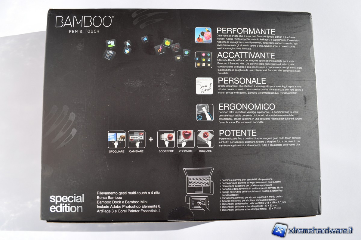 La Bamboo Special Edition è racchiusa in una scatola di adeguate dimensioni e di un colore nero opaco molto elegante. Essendo un prodotto destinato a persone del campo della grafica ed affini, non poteva di certo essere imballato in un anonimo involucro di cartone. La confezione, infatti, risulta piuttosto curata sia dal punto di vista estetico, sia, soprattutto, dal punto di vista della sicurezza dell’imballaggio contro eventuali urti. La grafica propone nella parte superiore della scatola un’immagine della tavoletta stampata su fondo nero, con la scritta al centro con il nome del prodotto, e in basso a destra un’impressione argentata a sottolineare che questo prodotto è un’edizione speciale. Nel retro della scatola troviamo rapprensentate ordinatamente e in maniera piuttosto intuitiva le caratteristiche salienti del prodotto.