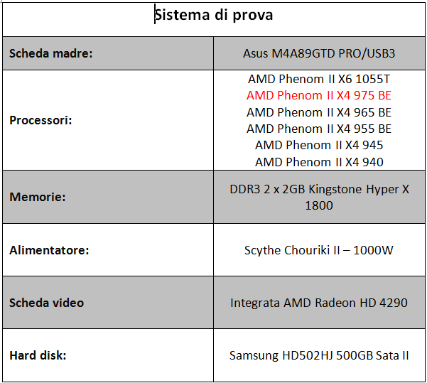 Di seguito riportiamo la tabella contenente le specifiche tecniche del sistema utilizzato per effettuare i test del processore.