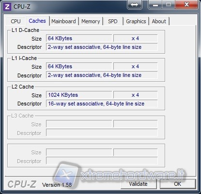 Nella prima finestra possiamo ricavare informazioni riguardati l’architettura della CPU oltre che la frequenza e il numero di Core/Thread. Questo processore facente parte della famiglia APU è basato su architettura Llano prodotta con tecnologia a 32nm. Come per tutte le altre soluzioni Llano anche questa APU è installabile su Socket FM1 dotato di 905 pin.