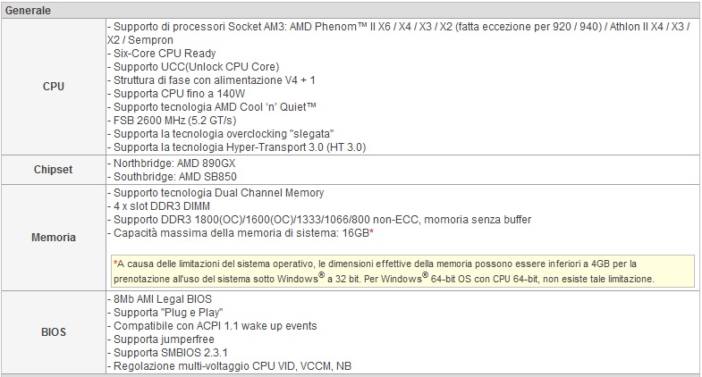Il supporto alle più attuali CPU è garantito fino agli attuali sei core X6 con un tdp di 140w massimo grazie alla costruzione del sistema di alimentazione a 4+1 fasi, il top gamma di AMD al momento è identificabile nel modello Phenom II AM3 1090T, inoltre nel bios troviamo la funzione Supporto UCC (Unlock CPU Core) che permette il risveglio di alcuni core nel caso questi siano addormentati, vi ricordiamo che non è garantito il corretto funzionamento, ma di volta in volta sarà necessario verificare il corretto funzionamento.