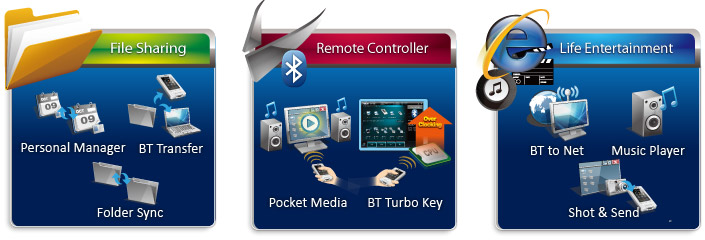- Folder Sync, BT Transfer, Shot & Send, BT to Net, Music Player, Personal Manager, BT Turbo Remote