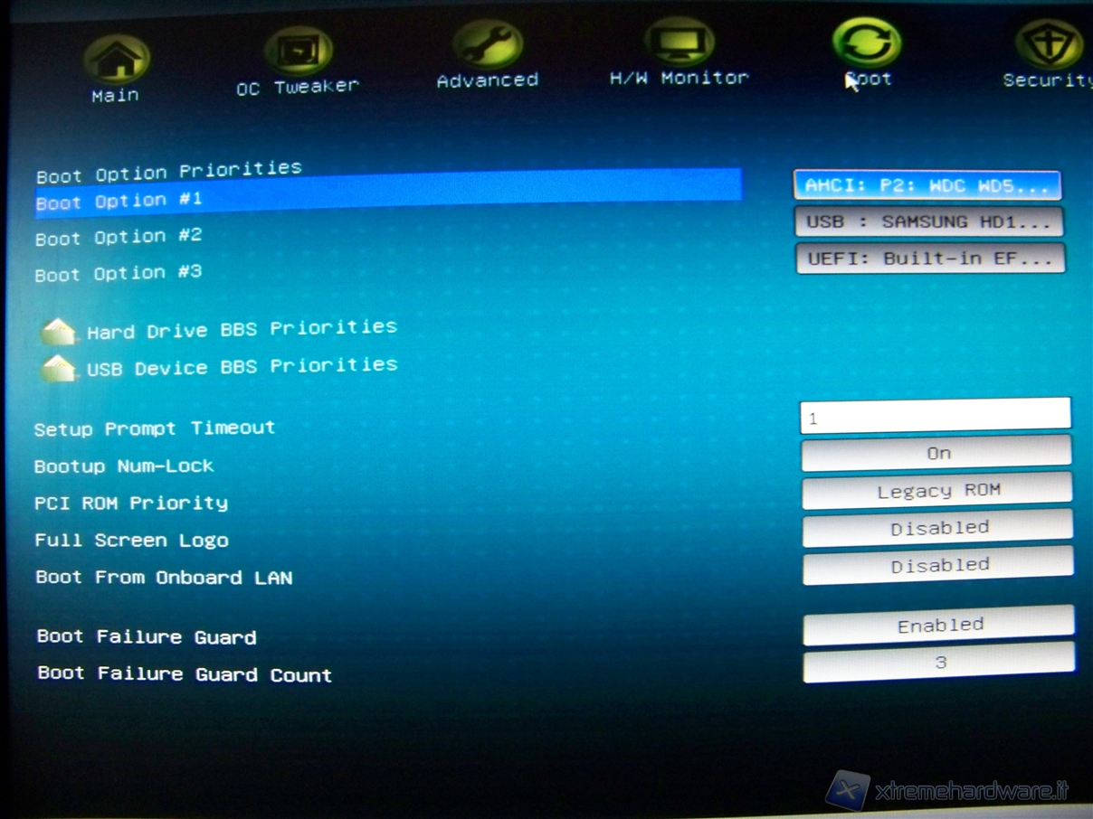 Come in tutti i BIOS prodotti ovviamente anche in quello della ASRock A55 Pro3 è presente il menù “Boot” che ci permette di impostare l’ordine di boot delle nostre periferiche, ed altre funzioni quali Full Screen Logo, Boot From Onboard LAN, Bootup Num-Lock e molti altri.