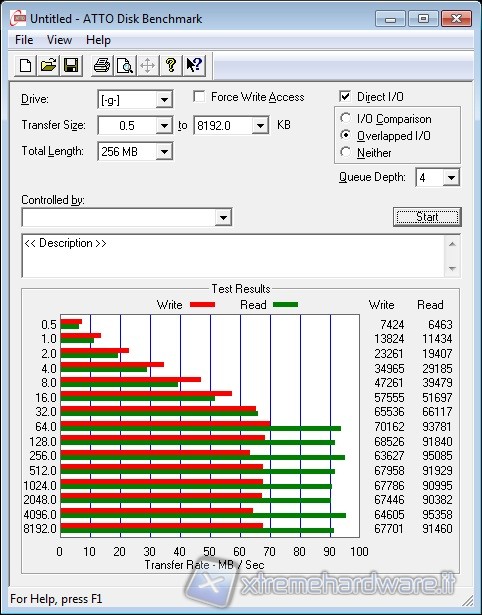 Esaminiamo di seguitola bandwidth della Sabertooth X79 dal lato dellaconnettività USB. Verranno utilizzati ATTO ed CristalDiskMark per misurare i valori di Transfer-Rate connettendo il pen drive USB 3.0 Kingston DT-Ultimate 64GB sia ad una porta USB 3.0 sia alla più lenta USB 2.0. I risultati ottenuti sulla porta USB 2.0 sono riportati di seguito: