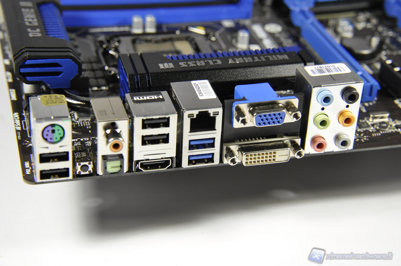 Nel pannello I/O posteriore troviamo due delle 4 porte gestite dal chipset, mentre le schede madri con  chipset Intel Z68 dovevano ricorrere a controller di terze parti. Chiudono il quadro delle connessioni 4 porte USB 2.0, una connessione fast Ethernet 10/100/1000 controllati dal chip Intel 82579V, i consueti 6 jack da 3.5mm per l’audio HD 7.1 canali gestiti dal Realtek ALC898. Abbiamo numerose uscite video, come una connessione in standard HDMI, un’uscita 15 pin D-Sub (VGA), un’uscita DVI. Completano il quadro generale delle connessioni posteriori due connettori, uno coassiale ed un altro SPDIF ottico. Infine non poteva mancare il consueto pulsante per il Clear del CMOS.