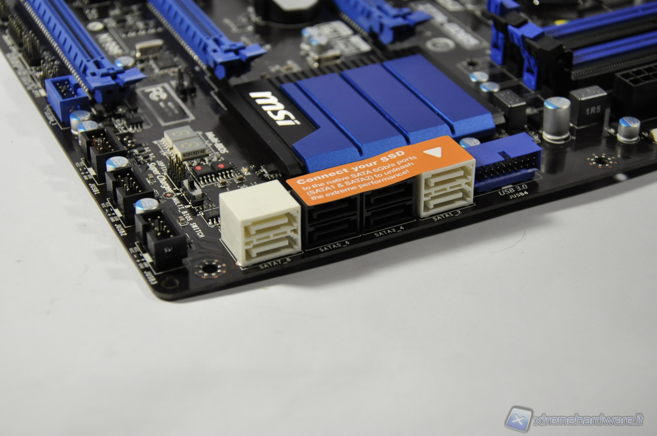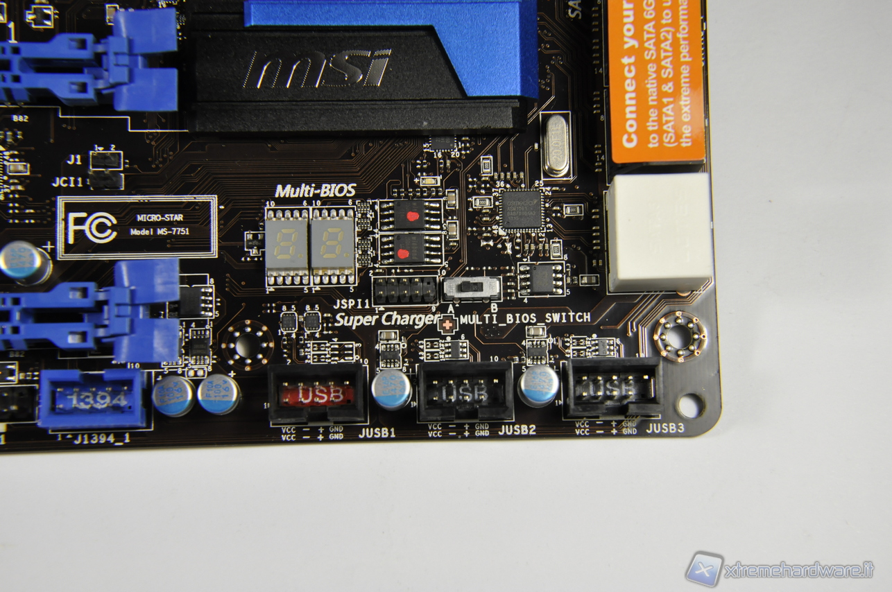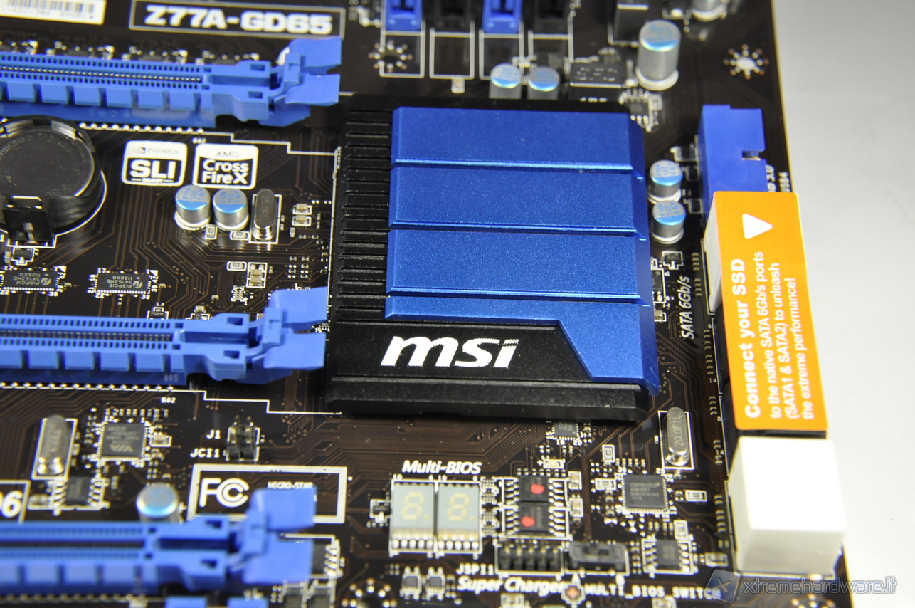 Grazie ai processi di miniaturizzazione che consentono di inglobare nella CPU sempre maggiori funzionalità, al South Bridge è relegato il solo compito di gestire i canali per i dispositivi di massa, audio ed Ethernet. Per cui il calore che si sviluppa è minimo e i dissipatori utilizzati sono scelti più per un impatto estetico che di reale necessità. Utilissimo invece si rivela ancor oggi il display a 2 cifre per la lettura dei codici in fase di boot e poter intervenire in modo mirato all’occorrenza in caso di problemi. Per finire il numero di porte SATA presenti sul PCB direttamente collegate al Chipset Intel Z77 sono 6, di cui le 2 bianche in standard SATAIII 6Gbps, le altre 4 nere sono invece in standard SATAII 3 Gbps. Sono presenti inoltre altre due connessioni SATAIII 6Gbps (anch’esse bianche) ma sono collegate al controller ASMedia ASM1061.