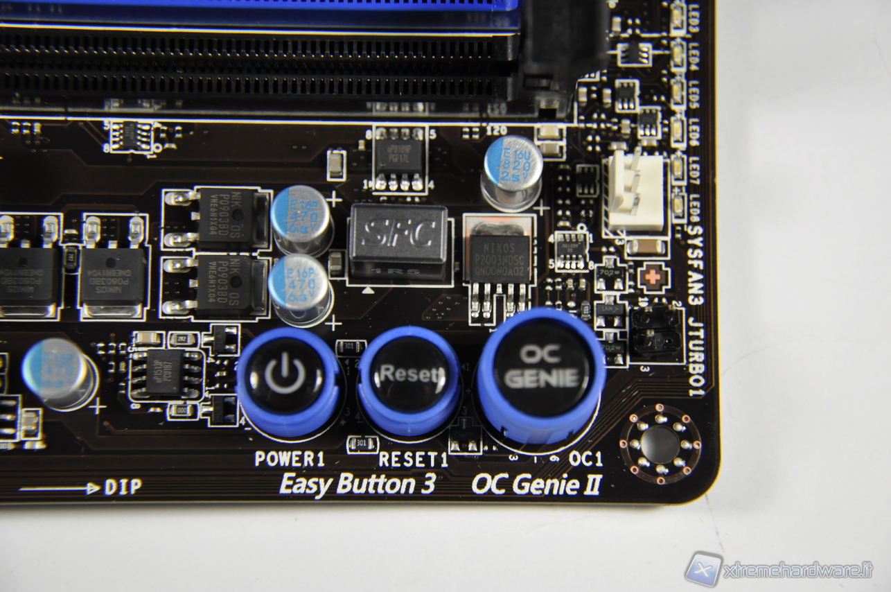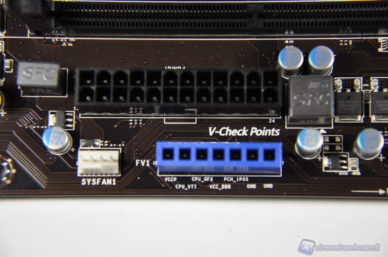 Altra novità nella Z77A-GD65 troviamo i V-Check Points, come li chiama il fornitore che offrono con l’ausilio di un Multimetro la possibilità di lettura diretta delle tensioni rispettivamente del Vcore, Vtt, Vddr, Vgpu e del Vpch. Altra novità che farà piacere chi utilizza le Mainboard a banco, i tasti di Accensione, Reset e OC Genie con cui si può richiamare un livello di overclock pre-impostato dall’utente, che in questa edizione è stato aggiornato alla versione 2.