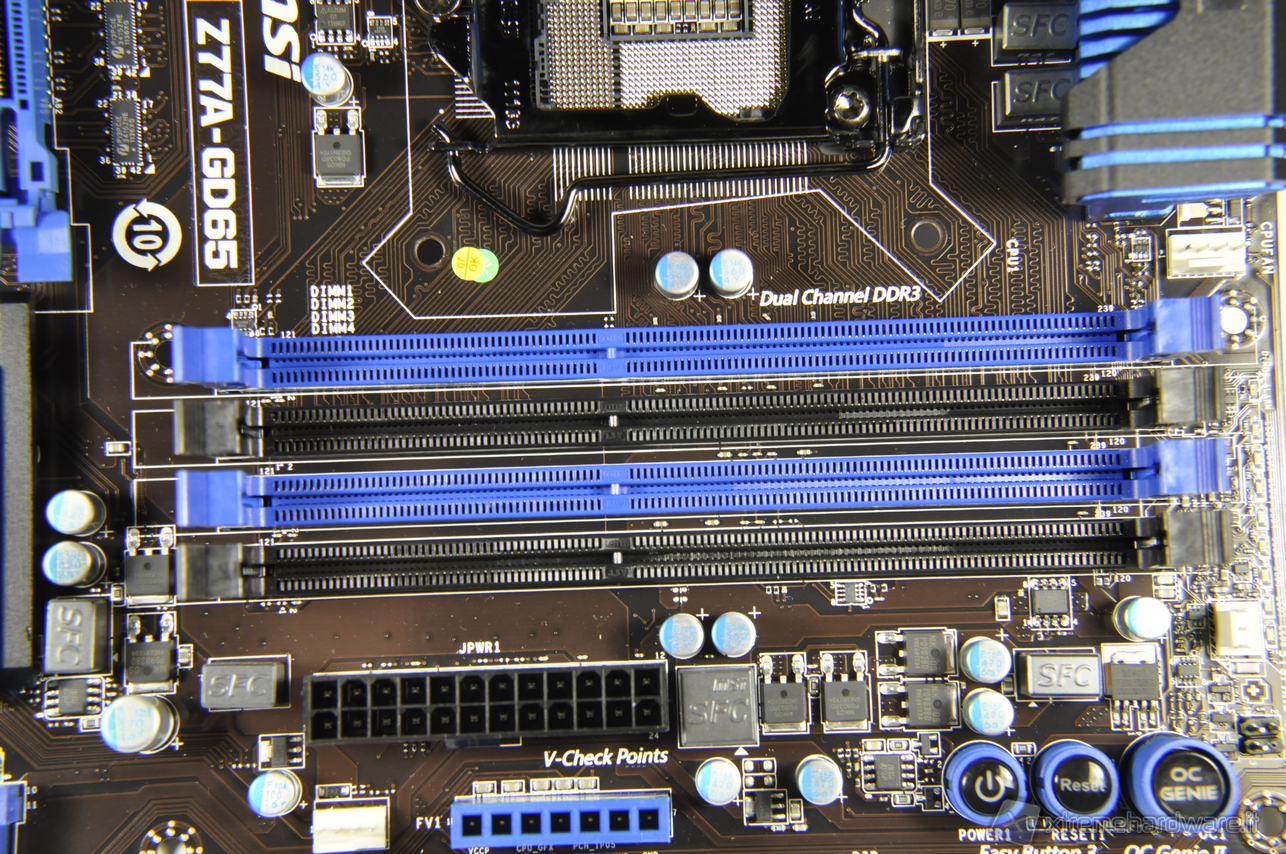 I 4 slot di memoria presenti sul PCB, di tipo DDR3, consentono d’installare un massimo di 32 GB distribuiti su 4 Dimm da 8 GB ciascuna e tramite overclock MSI con la Z77A-GD65 riesce a spingere la frequenza delle memorie fino a 2666 MHz.