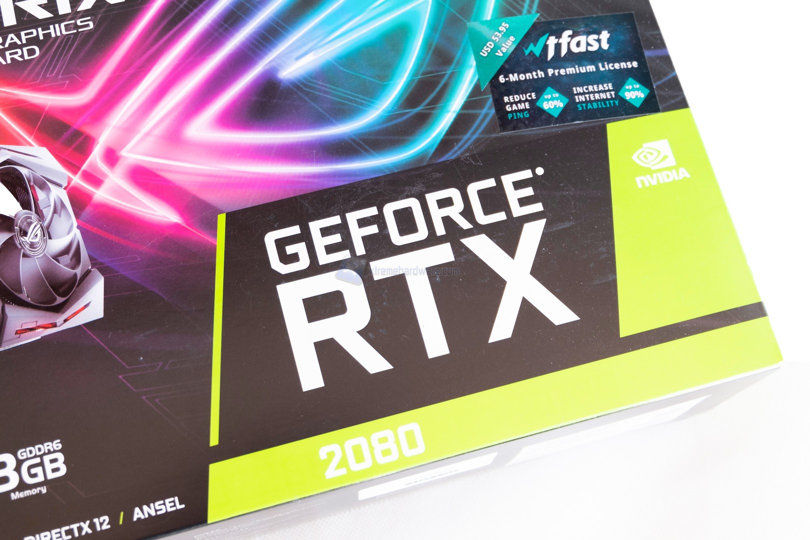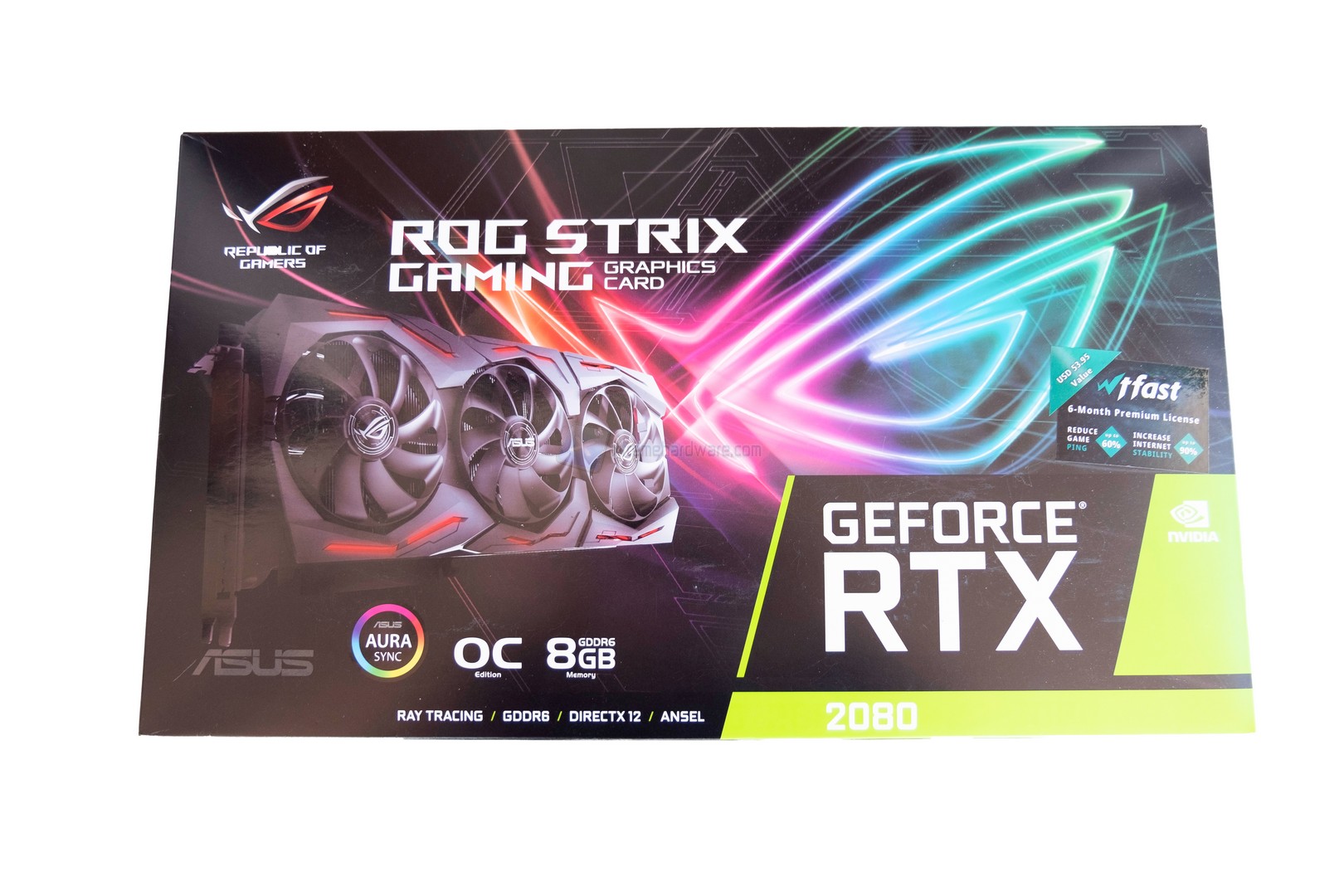 La confezione dell’ASUS RTX 2080 Strix si caratterizza per il classico design ASUS, infatti nella parte frontale troviamo il nome del prodotto, un’immagine dello stesso, le caratteristiche principali ed alcune tecnologie supportate.
