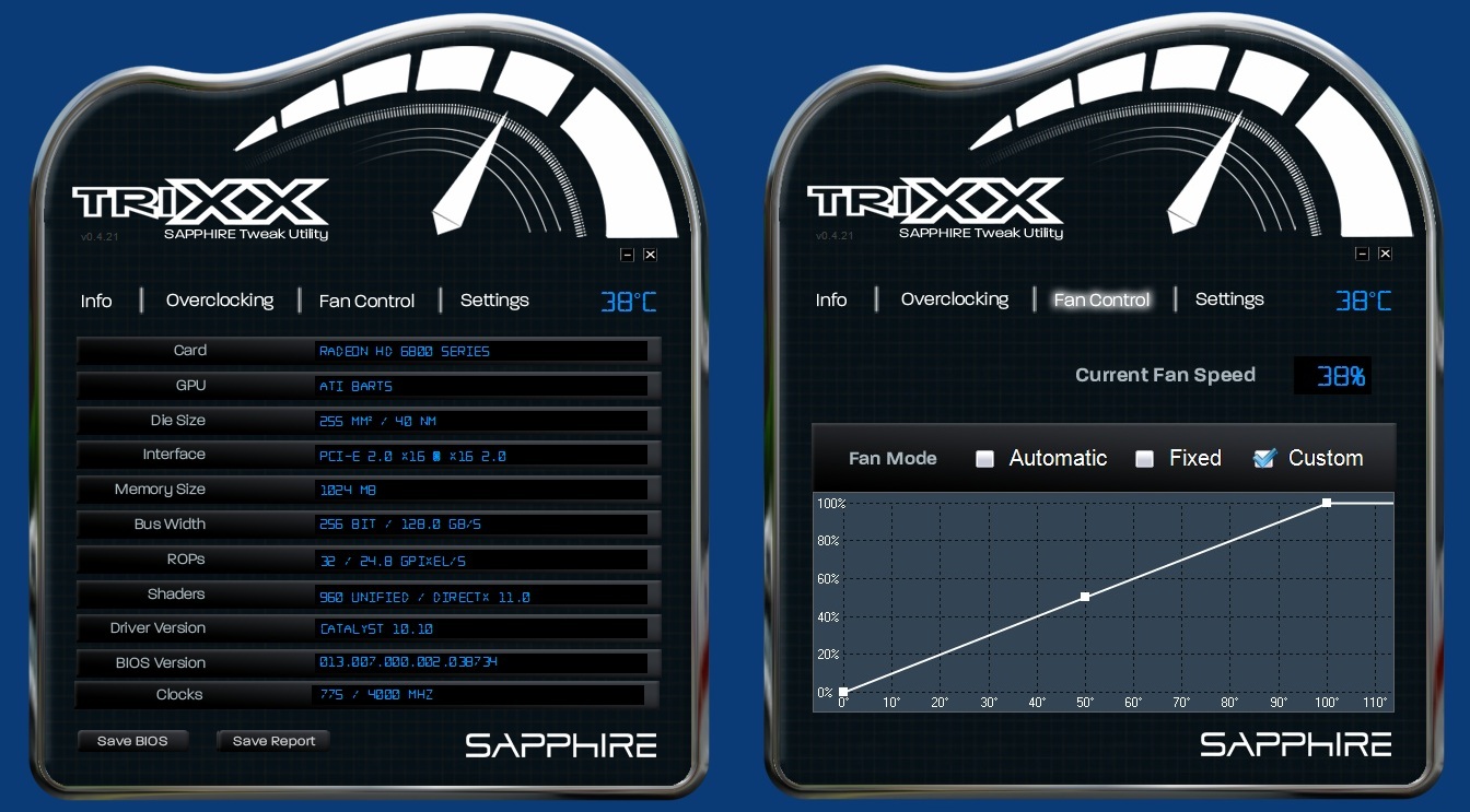 Come abbiamo avuto modo di leggere, nel corso della recensione, la scheda è già stata provata al massimo consentito da pannello di controllo dei Catalyst, ovvero a 850/4800, rispettivamente per core e memorie. Ovviamente questo limite può essere “aggirato” in svariati modi. E’ possibile ad esempio intervenire a livello Bios o più semplicemente utilizzando software alternativi come l’ormai famoso AfterBurner di MSI, oppure il recente TriXX di Sapphire. Entrambi questi software funzionano indipendentemente dalla marca della scheda in uso, quindi saranno utilizzabili da tutti senza problemi di sorta. Ecco come appare TriXX una volta eseguito: