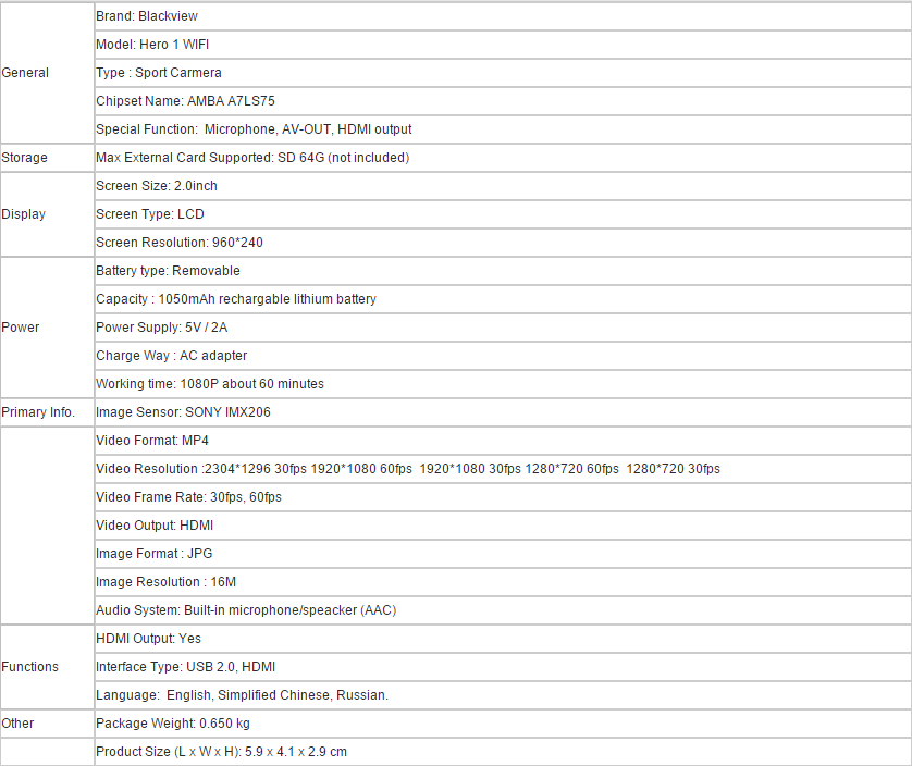 Bisogna porre particolare attenzione sul fatto che questa cam monti un chipset Ambarella A7LS75 che garantisce una ripresa video di ottima qualità, è importante inoltre notare che i video possono essere girati in FullHD a 60fps, parametro fondamentale per ottenere riprese fluide e omogenee. La connettività wifi completa il quadro hardware rendendo la Blackview Hero 1 una cam completa e versatile.