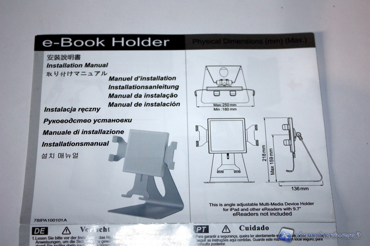 Già dalla confezione si capisce di cosa stiamo parlando, un supporto per tablet o ebook in genere, capace di ospitare dispositivi fino ad una dimensione massima di 9.7". Da ciò possiamo dedurre che è appositamente studiato per iPad e iPad 2 ma, come vedremo, sarà possibile utilizzarlo anche su tablet più ingombranti.