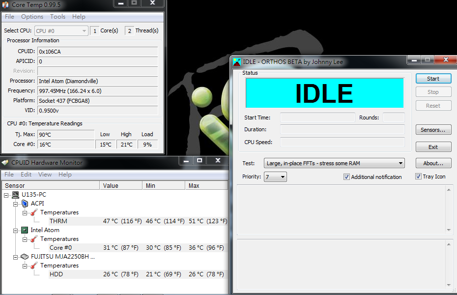 In modalità cinema l’U135 è rimasto acceso per 4 ore e 50 minuti. La durata in idle è leggermente superiore a quella dei precedenti modelli con batteria a 6 celle ma equipaggiati con la vecchia piattaforma Atom. Tuttavia ci saremmo potuti aspettare risultati migliori grazie alla piattaforma PineTrail. Altri netbook con PineTrail sembrano garantire autonomie sensibilmente maggiori.