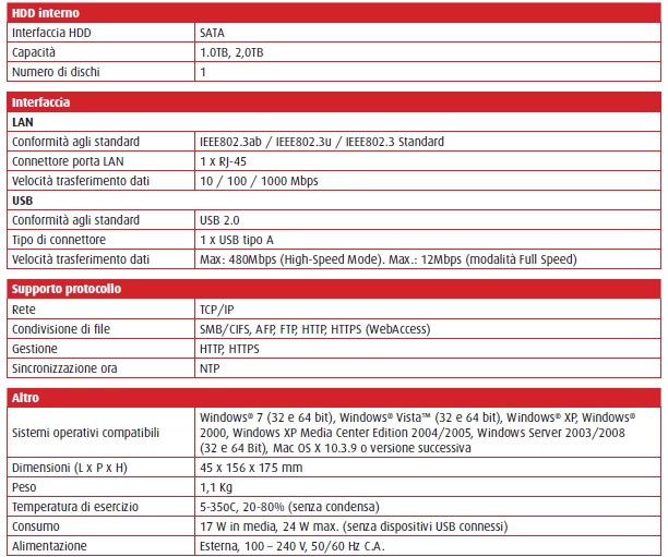 Riportiamo di seguito la tabella delle specifiche e la tabella delle funzionalità, prese direttamente dal sito del produttore.