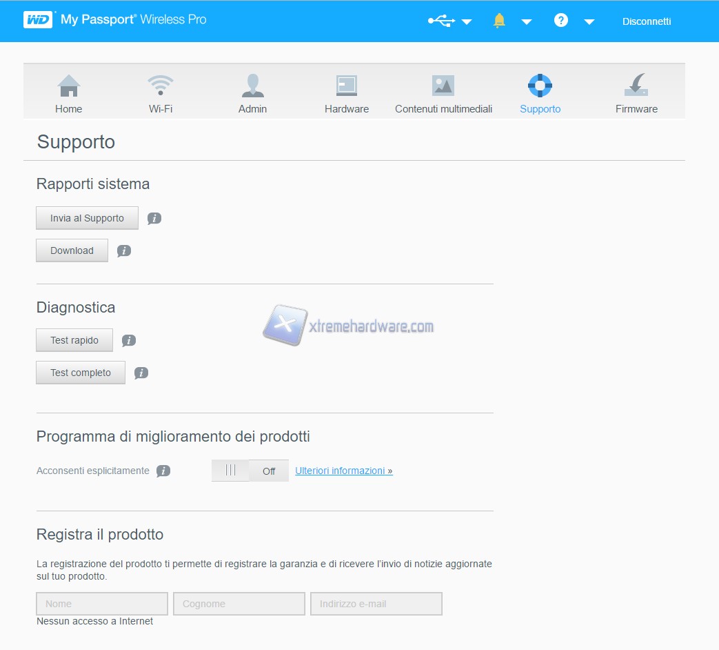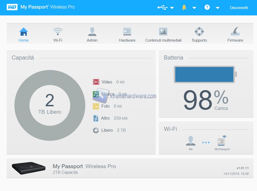 Ora analizziamo il software di gestione del Western Digital My Passport. Il software non va installato, infatti basta digitare sulla barra di ricerca del nostro browser preferito il suddetto indirizzo: 192.168.60.1. Nella prima pagina, contraddistinta dall’icona Home, possiamo osservare lo status dell’Hard Disk, come ad esempio: carica della batteria integrata, capacità residua / utilizzata e versione del firmware.