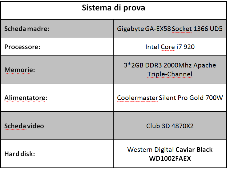 Per i test effettuati con l’Integral S abbiamo usato la seguente configurazione, equipaggiata con Windows Seven Ultimate 64bit. Il disco utilizzato è stato un Western Digital Caviar Black WD1002FAEX con capienza pari a 1TB. Di seguito riportiamo una tabella con l’hardware utilizzato.