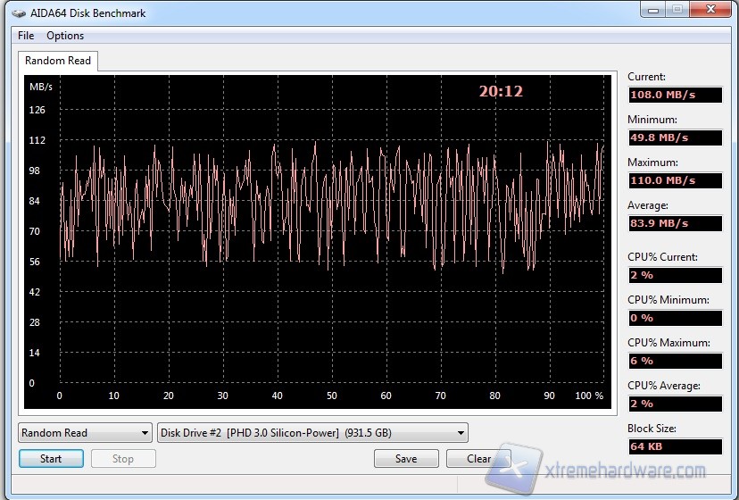 L'ultimo test che abbiamo eseguito utilizza il software AIDA. Abbiamo selezionato il test RANDOM READ. AIDA ci dà ulteriore conferma delle ottime prestazioni del dispositivo, con una velocità di lettura media di circa 84 MB/s.