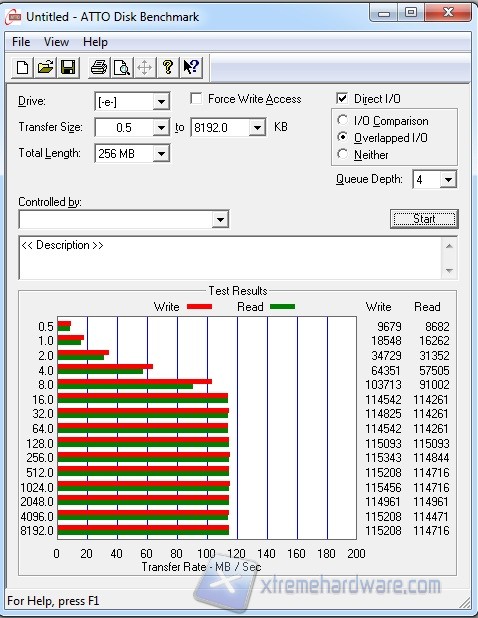 Vediamo qui  come il transfer rate, sia in lettura che scrittura, tenda quasi all'ottimo valore di 115 MB/s, tranne che i risultati ottenuti con blocchi più piccoli, che registrano prestazioni inferiori.