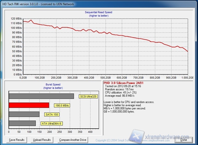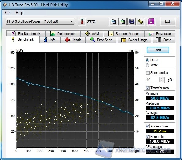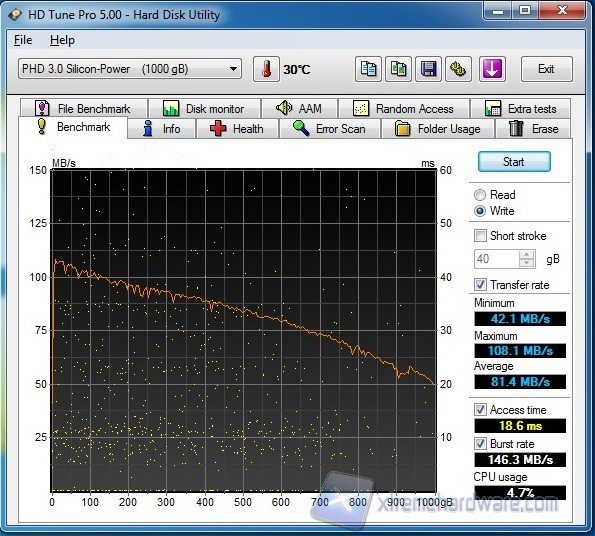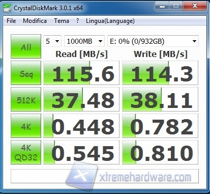 I valori ottenuti relativi al benchmark sia in lettura sia in scrittura dimostrano le ottime  prestazioni del disco, che si attestano in entrambi i casi attorno ai 100-110 MB/s. Nella media degli HD 2,5” gli access time, che risultano attorno ai 19 ms.