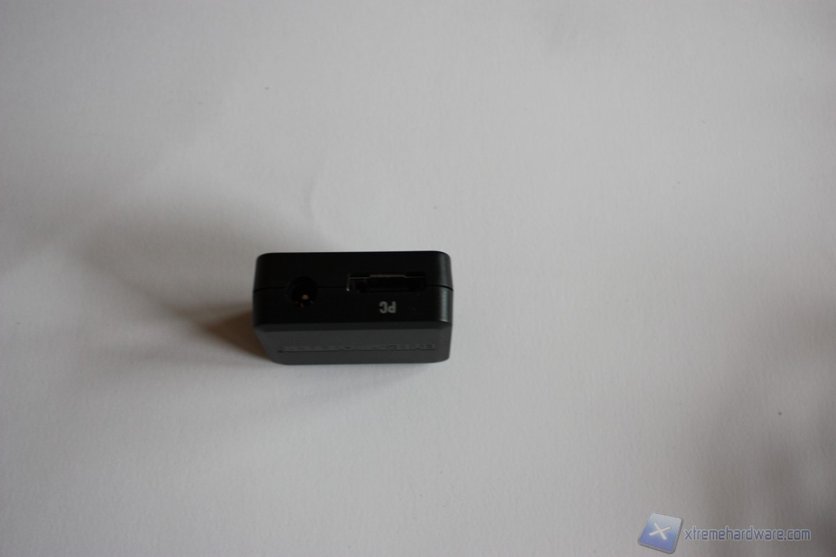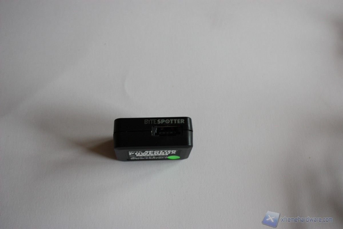 Il Byte Spotter Power Box, che altro non è il fulcro di connessione tra il box e il computer. Il Byte Spotter Power Box è un box di ridotte dimensioni di colore nero che presenta ad un'estremità il jack al quale va collegato l'alimentatore supplementare per alimentare gli Hard Disk e un ingresso e-Sata che farà tramite il cavetto apposito e-Sata a USB per il collegamento al computer. L'altra estremità, invece, è caratterizzata solamente da un ingresso e-Sata (anche qui) che servirà a collegare l'adattatore alimentazione e dati al retro degli Hard Disk. Su di esso sono riportati il part number, il voltaggio, la potenza a cui deve lavorare e il sito del produttore.