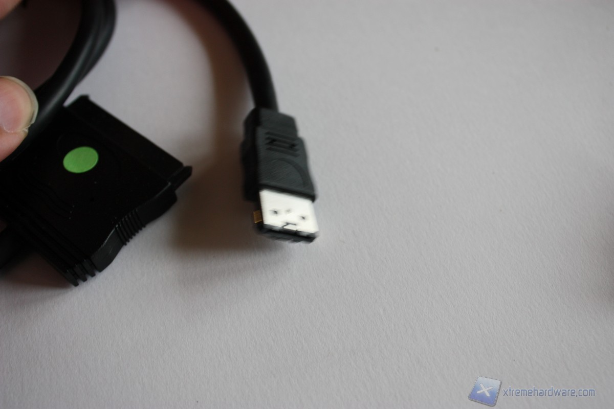 Ora passiamo all'adattatore Sata-alimentazione a e-Sata. Caratterizzato da un cavo lungo circa 30 cm in materiale plastico nero molto flessibile. Troviamo ad un'estemità la porta e-Sata da collegare al Byte Spotter Power Box mentre all'altra, come accennato prima, gli ingressi per il connettore Sata e di alimentazione degli hard disk ormai standard diffuso.