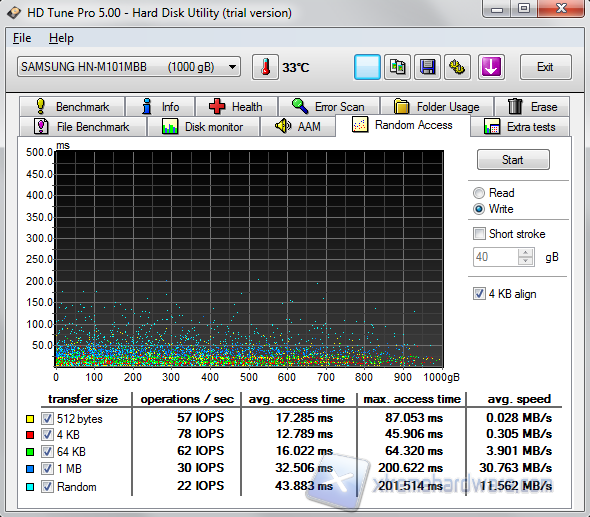 HD Tune Pro è un utility per hard disks e SSDs con molte funzioni; può essere utilizzata per misurare in modo accurato le performance del nostro drive alla ricerca di errori, in quanto permette anche di monitorare lo stato vitale del drive, permette di cancellare i dati in modo sicuro e molto altro ancora. La versione da noi utilizzata è l'ultima disponibile al momento e si tratta della 5.00. Il programma è disponibile in due versioni, una freeware (HD Tune) ed una a pagamento (HD Tune Pro). Nel nostro caso è stato necessario utilizzare la versione Pro, in quanto è l'unica a misurare le prestazioni del drive in scrittura.
