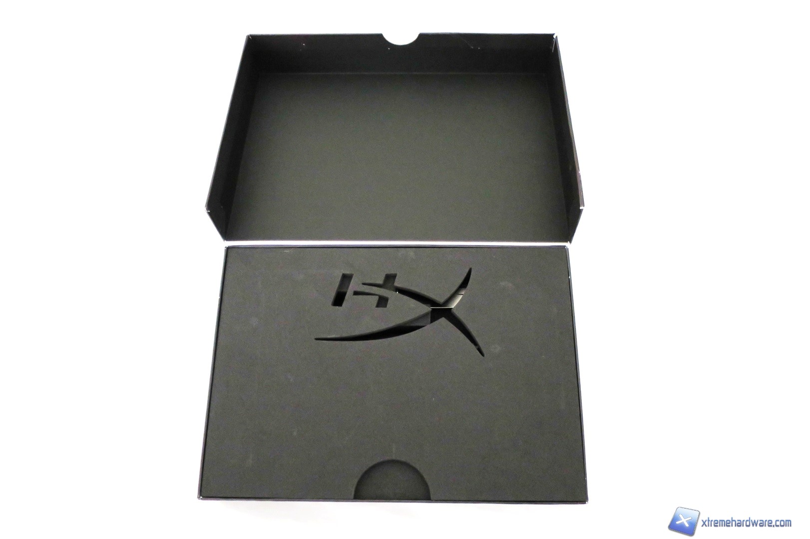 Sollevato il coperchio del cofanetto troviamo il drive ed il relativo bundle coperti da un primo strato di gomma con ricavato all’interno il logo HyperX. Rimosso, troviamo finalmente il drive ed il bundle ospitati in un ulteriore sagoma di gomma.