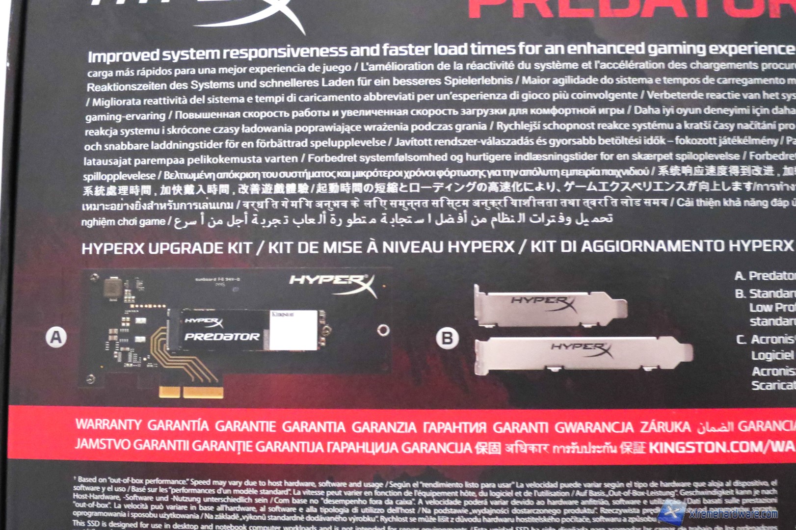 Il Kingston HyperX Predator ci giunge in un cofanetto di cartone con la classica grafica illustrativa dei prodotti HyperX. Nella parte frontale della confezione trovano posto l’immagine illustrativa del drive, il modello, la capacità ed altri informazioni relative al drive.