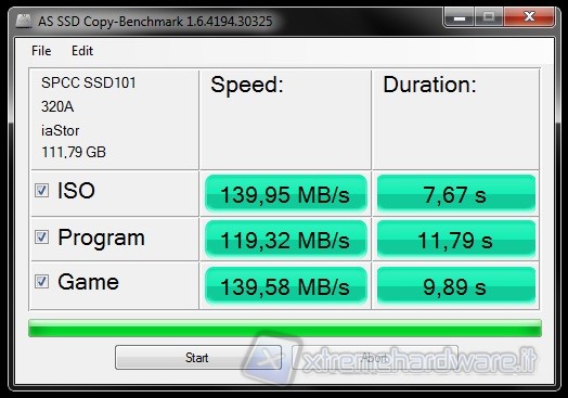 AS SSD Benchmark è un'altro benchmark gratuito studiato appositamente per SSD. Effettua i suoi test sintetici senza adoperare la cache del sistema operativo che va ad influenzare pesantemente i risultati del Transfer Rate, inoltre determina i tempi di accesso del drive sfruttando l'intera capacità del drive stesso. Tutti i test vengono effettuati utilizzando dati non comprimibili.