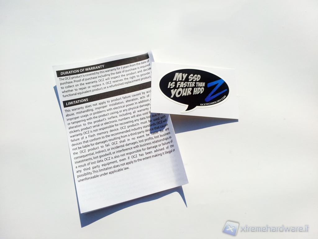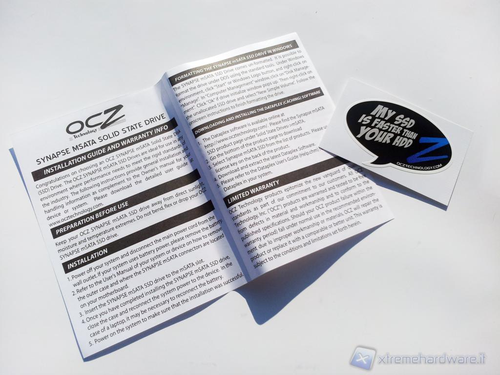 Anche la confezione interna e il contenuto è rimasto invariato, sul manuale di installazione e di garanzia è presente anche il codice di licenza per il software NVELODataplex (che oscuriamo per ovvie ragioni) mentre è presente, come per gli altri drive OCZ, il simpatico adesivo riportante la scritta "My SSD isfasterthanyour HDD" anche se in questo caso non è proprio giusta in quanto il nostro HDD, proprio grazie all'utilizzo del Synapse, potrà diventare, in determinate circostanze, più veloce di un SSD Sata II ed in alcuni casi competere potrà con SSD Sata III top di gamma.