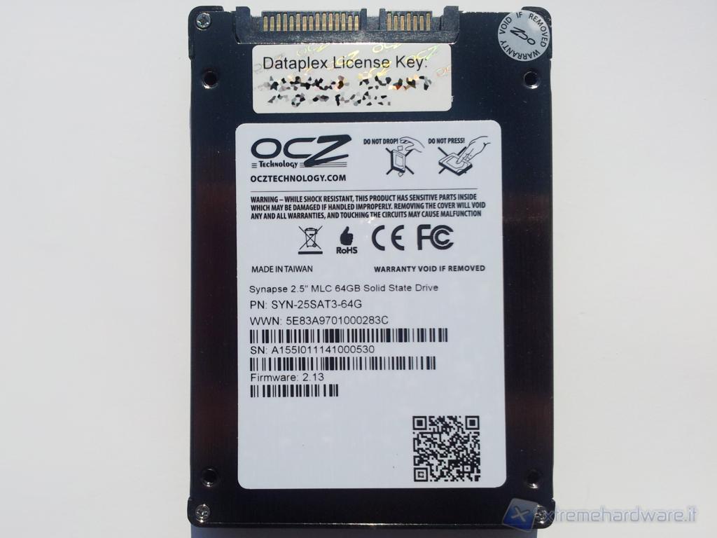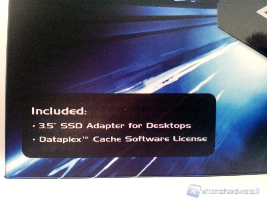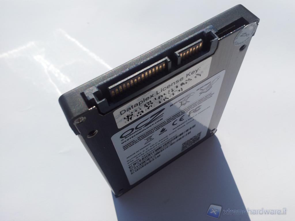 Nella parte anteriore sono presenti il logo OCZ, le caratteristiche tecniche principali, l'adesivo che indica la capacità del drive; centralmente spiccano il nome del drive e un'immagine dell’SSD stesso, realizzati con vernice lucida in rilievo su uno sfondo nero e blu. In basso a sinistra, inoltre, un riquadro ci informa che all'interno della confezione sono presenti sia l'adattatore da 3,5" ,sia la licenza per il software Dataplex.