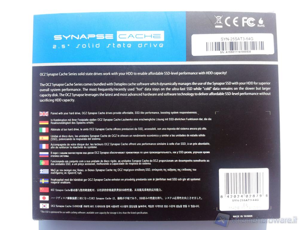 Nella parte posteriore è presente una breve descrizione in inglese del drive e una piccola introduzione tradotta in varie lingue tra cui l'italiano. In alto a destra è presente il Serial Number del Synapse e il Part Number della serie, nel caso della versione da 64GB è: SYN-25SAT3-64G mentre acquistando la versione da 128 sarà SYN-25SAT3-128G.