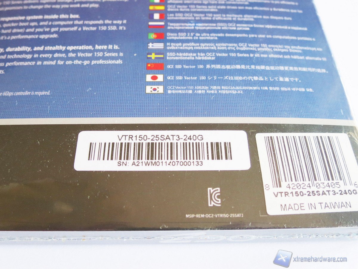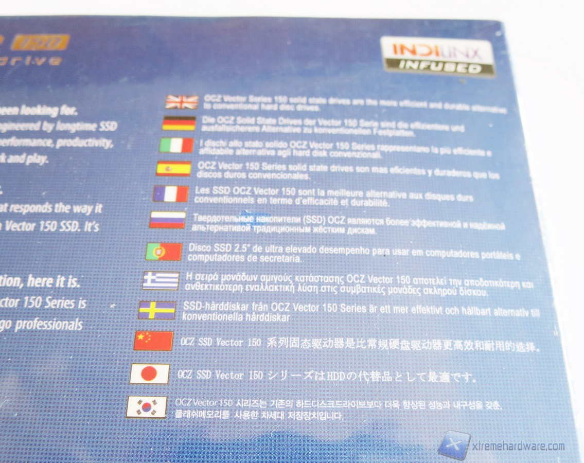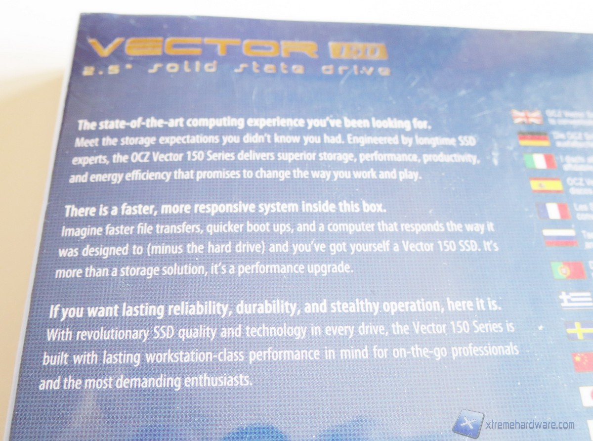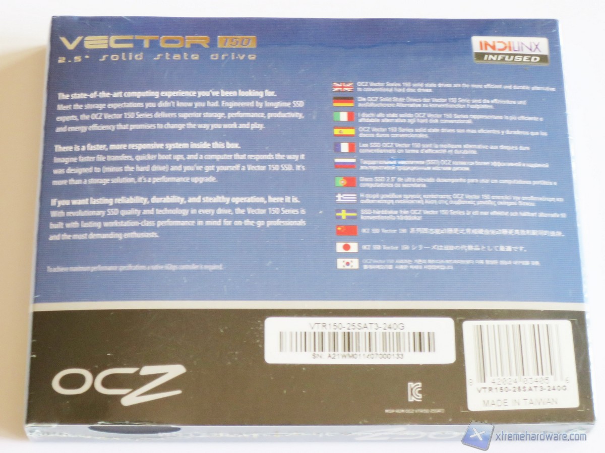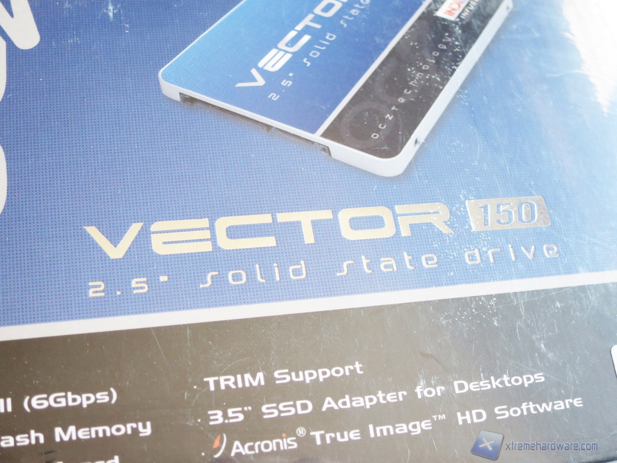 La confezione del Vector 150 è la classica che OCZ ha sempre usato per i suoi SSD. La colorazione è blu e nera così come quella del drive. Nella parte frontale troviamo un’immagine illustrativa del prodotto, il logo, il modello ed altre informazioni utili come incluso in bundle una chiave per l’attivazione del prodotto Acronis True Image HD oltre che un classico adattatore serigrafato OCZ.