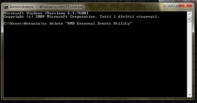 Una volta scritto sc delete "AMD External Events Utility" premete il tasto invio e dopo poco, comparirà il seguente messaggio: